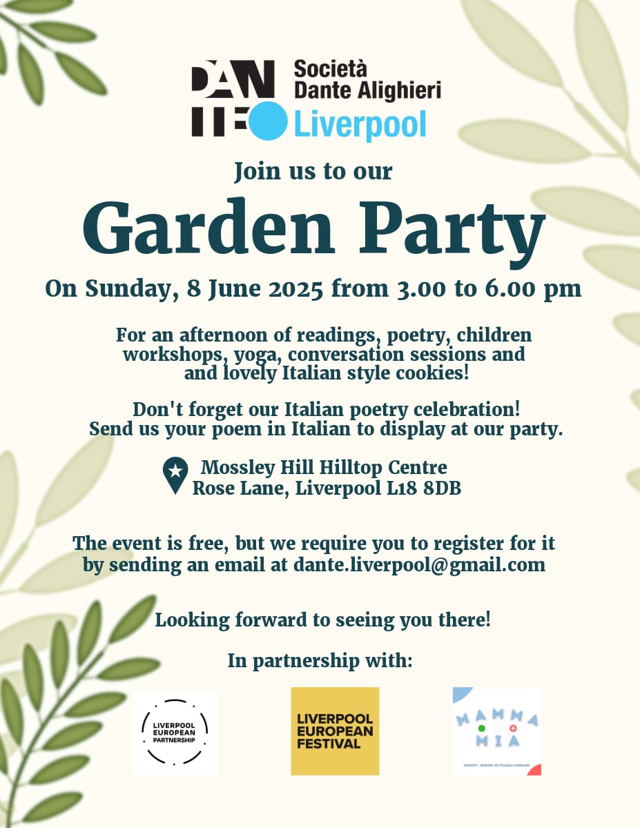 The aim of the Dante Alighieri Society is to foster the Italian language and culture in the world, promoting an interest in Italian civilisation, language and culture. We would like to welcome everyone to our Garden Party, where a few members from our book club/drama group will be reading poems and literature passages in Italian (English translation provided).