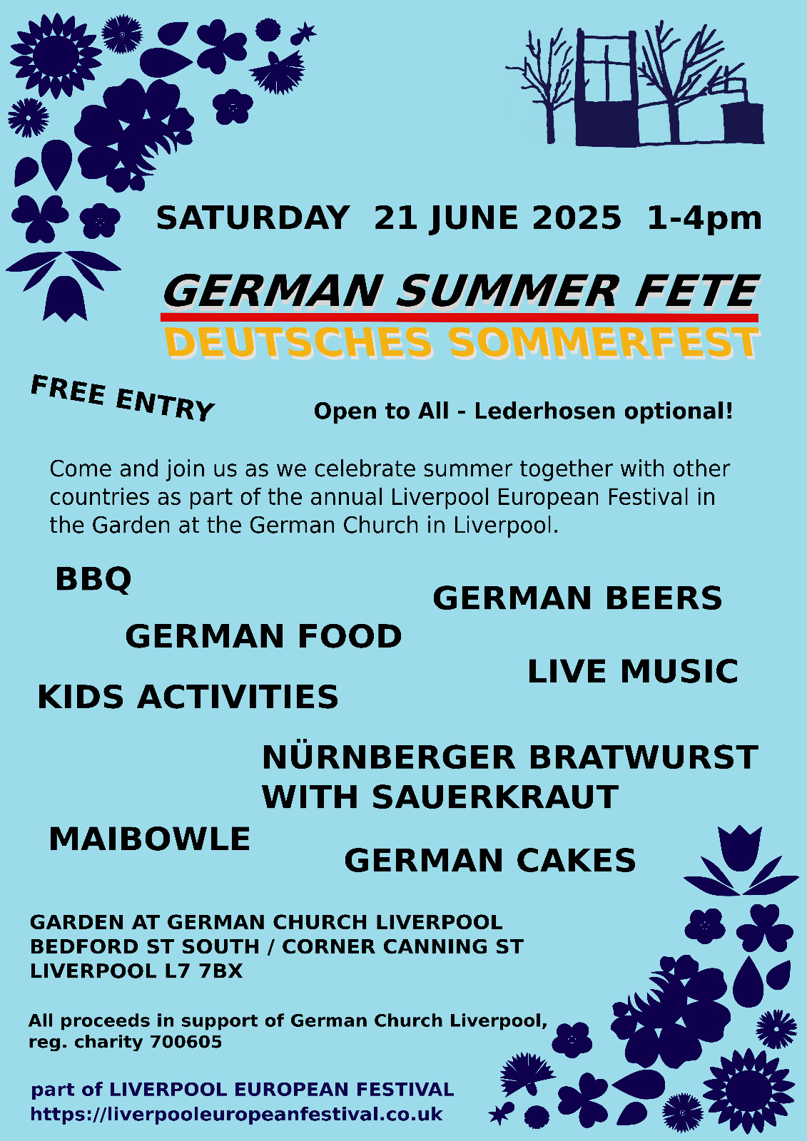 Come and join us as we celebrate summer – German style in the garden of the German Church in Liverpool (In case of bad weahter, we’ll have a cosy indoor Brauhaus!).